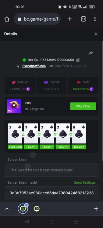 1. Hi fellow Hi-Lo's. Got lucky with 4 A & K .... And! I hit an almost 5000x Please see betlink to view/verify. https://bc.game/#/sd/10XNMKKTI9XXQR Hi everyone I got lucky with Kings and Aces Also had a great win with my almost 5000x multiplyer: here is the betlink https://bc.game/#/sd/10XNMKKTI9XXQR